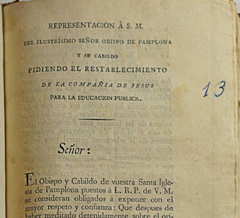 Representación á S.M. del Ilustrísimo Señor Obispo de Pamplona y su cabildo pidiendo el restablecimiento de la Compañía de Jesús para la Educación Pública… Pamplona … Enero de 1815.- Valencia: por D. Francisco Brusola, impres. de Cámar. de S.M., 1815.