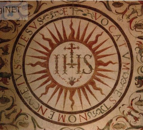 Camere di S. Ignazio : affresco rappresentante il Sigillo della Compagnia di Gesù, c. 1605. Roma (Italia). Roma : Tipografia Città Nuova della P.A.M.O.M., [s.a.] (printed in Italy)