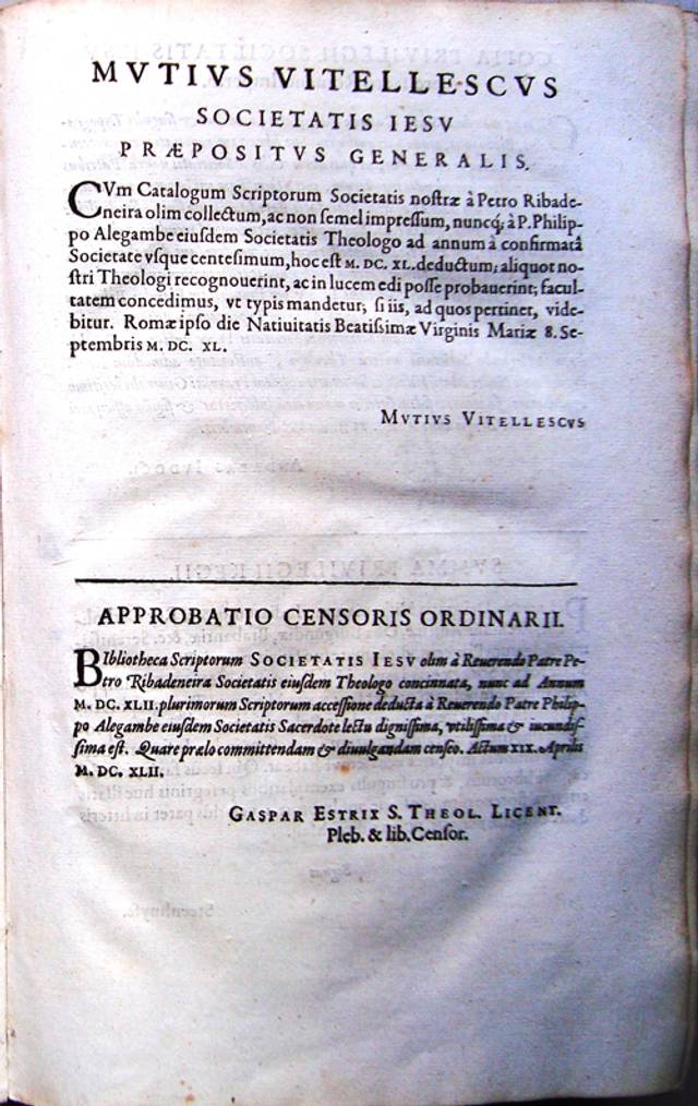 Bibliotheca scriptorum Societatis Iesu : post excusum anno MDCVIII catalogum R.P. Petri Ribadeneirae Societatis eiusdem Theologi, nunc... ad annum... MDCXLII editorum concinnata & illustrium virorum elogiis adornata / a Philippo Alegambe... ex eadem Societate Iesu.... -- Antuerpiae : apud Ioannem Meursium , 1643