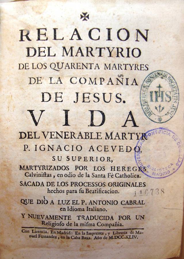 Relacion del martyrio de los quarenta martyres de la Compañia de Jesus : vida del venerable martyr P. Ignacio Acevedo, su superior, martyrizados por los hereges Calvinistas, en odio de la Santa Fé Catholica, sacada de los processos originales hechos para su Beatificación / que dió a luz el P. Antonio Cabral en idioma italiano ; y nuevamente traducida por un religioso de la misma Compañia. -